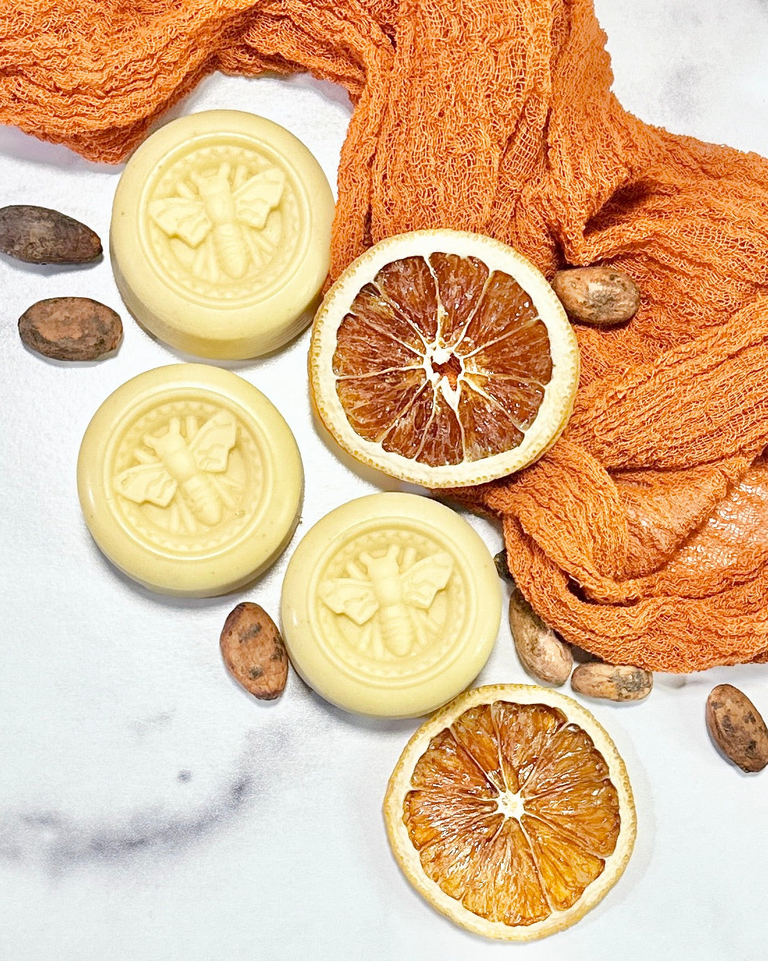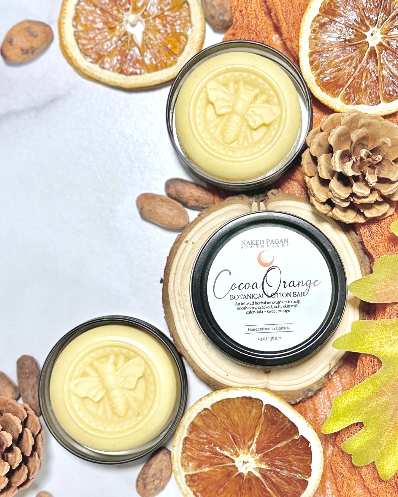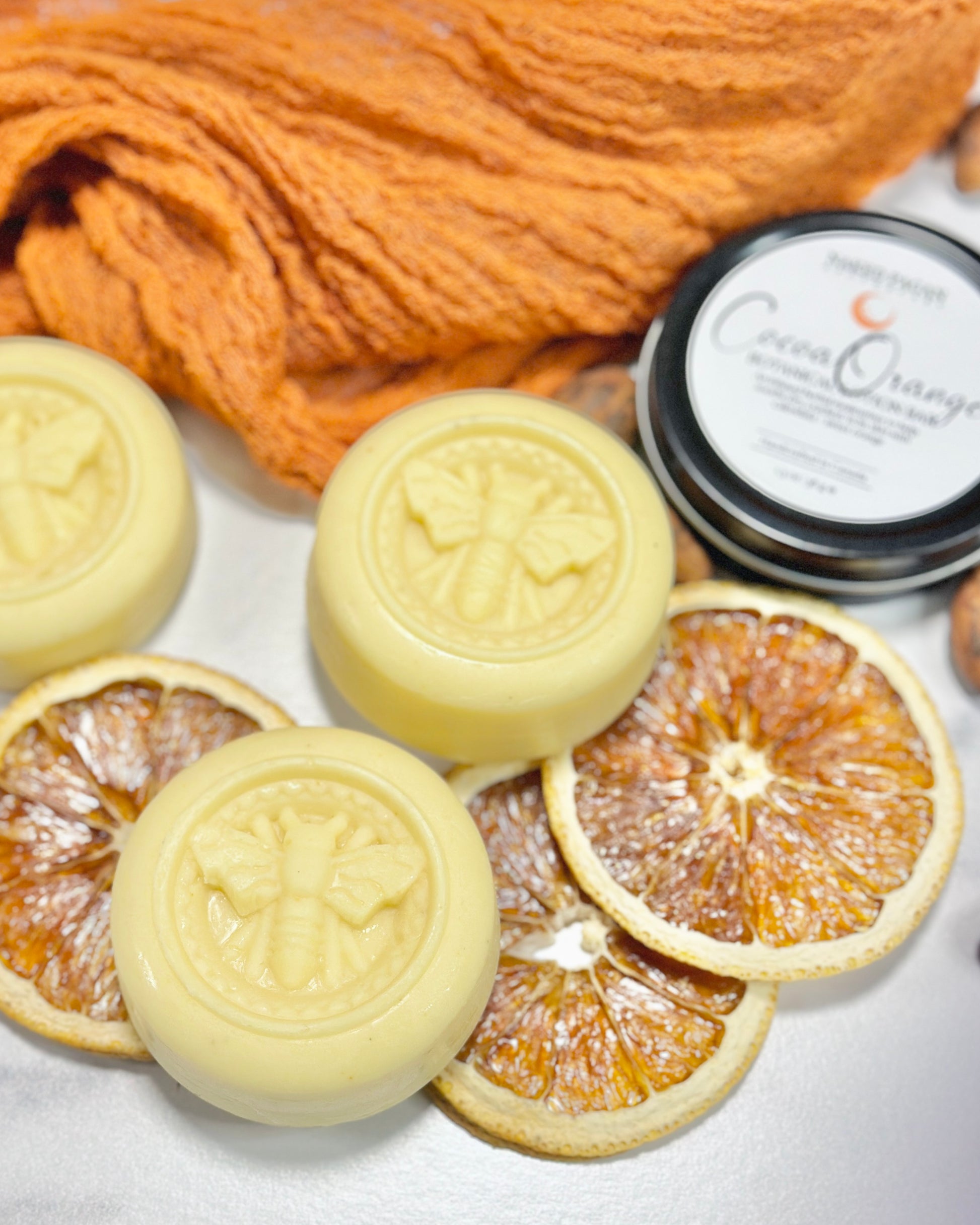 Our Cocoa Orange lotion bar is crafted using organic, skin-healing calendula slow-infused for six long, intentional weeks in sweet almond oil. After straining, it's blended with heaps of raw, chocolatey cocoa butter, mango butter, beeswax, babassu + jojoba oils as well as sweet orange essential oil to bring it all together