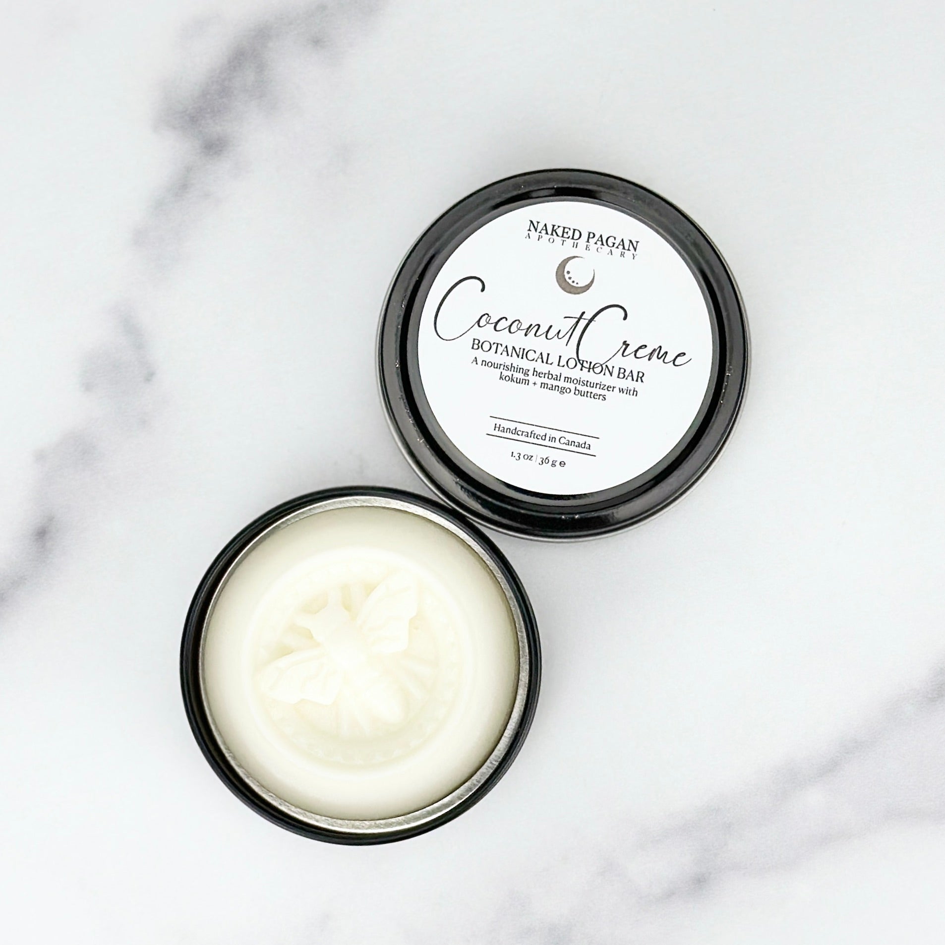 Our Lotion Bars come packaged in a black 2oz reusable Tin.