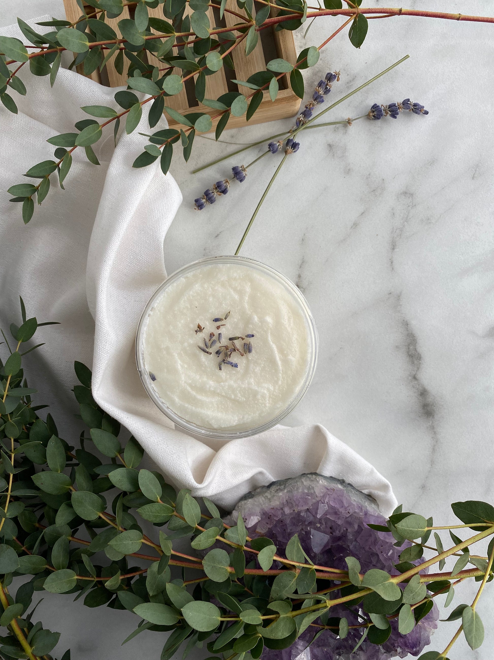Relax and unwind with our Lavender scrub. A true, classic lavender brightened up with just a hint of litsea cubeba. Adorned with an Amethyst Crystal