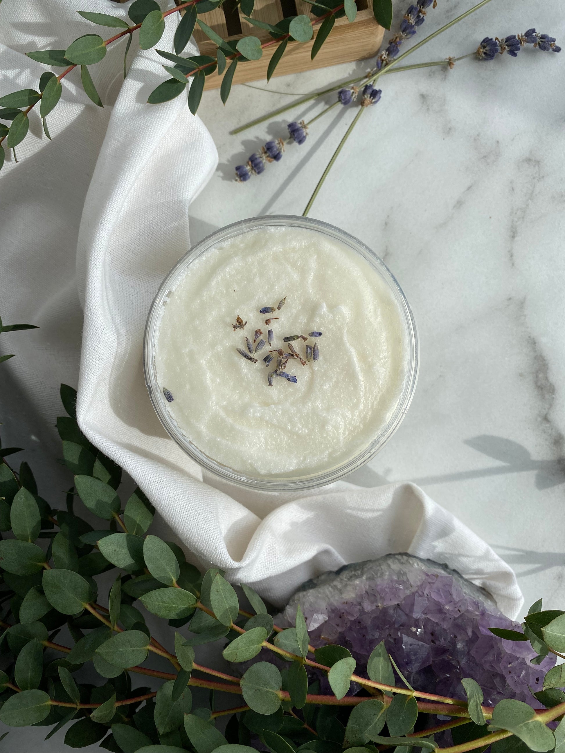 Our scrubs use organic cane sugar to gently exfoliate while moisturizing with our unique combination of creamy shea butter, sweet almond, coconut and avocado oils. When rubbed onto your skin, this creation morphs into a luxurious lotion that moisturizes your body and leaves your skin feeling delectably soft; the perfect addition to your shower and/or self care routine.