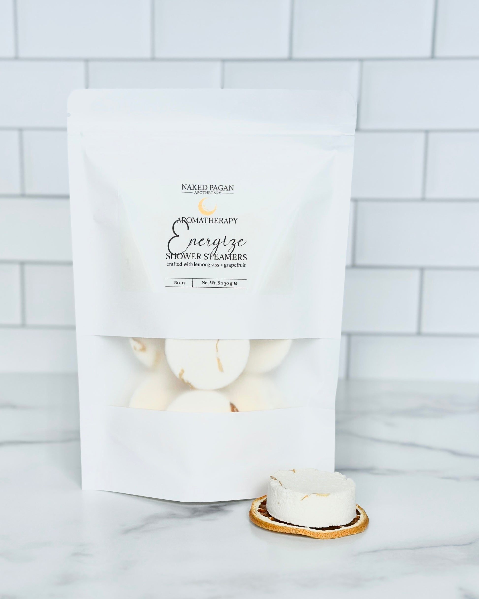 Transform your shower into a spa-like retreat with our aromatherpy shower steamers. Our Energize blend contains an invigorating citrusy essential oil blend chosen to help boost energy + uplift overall mood.