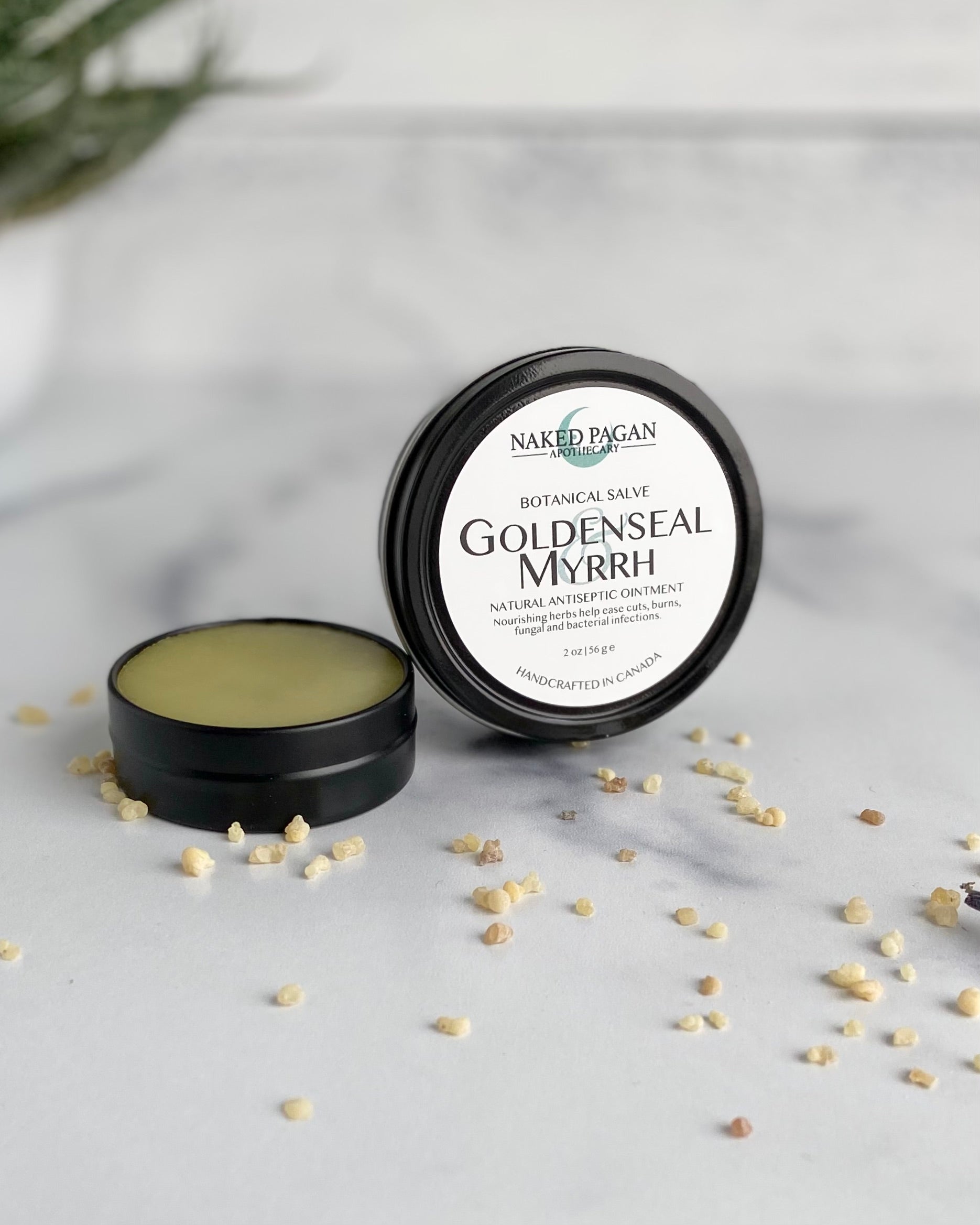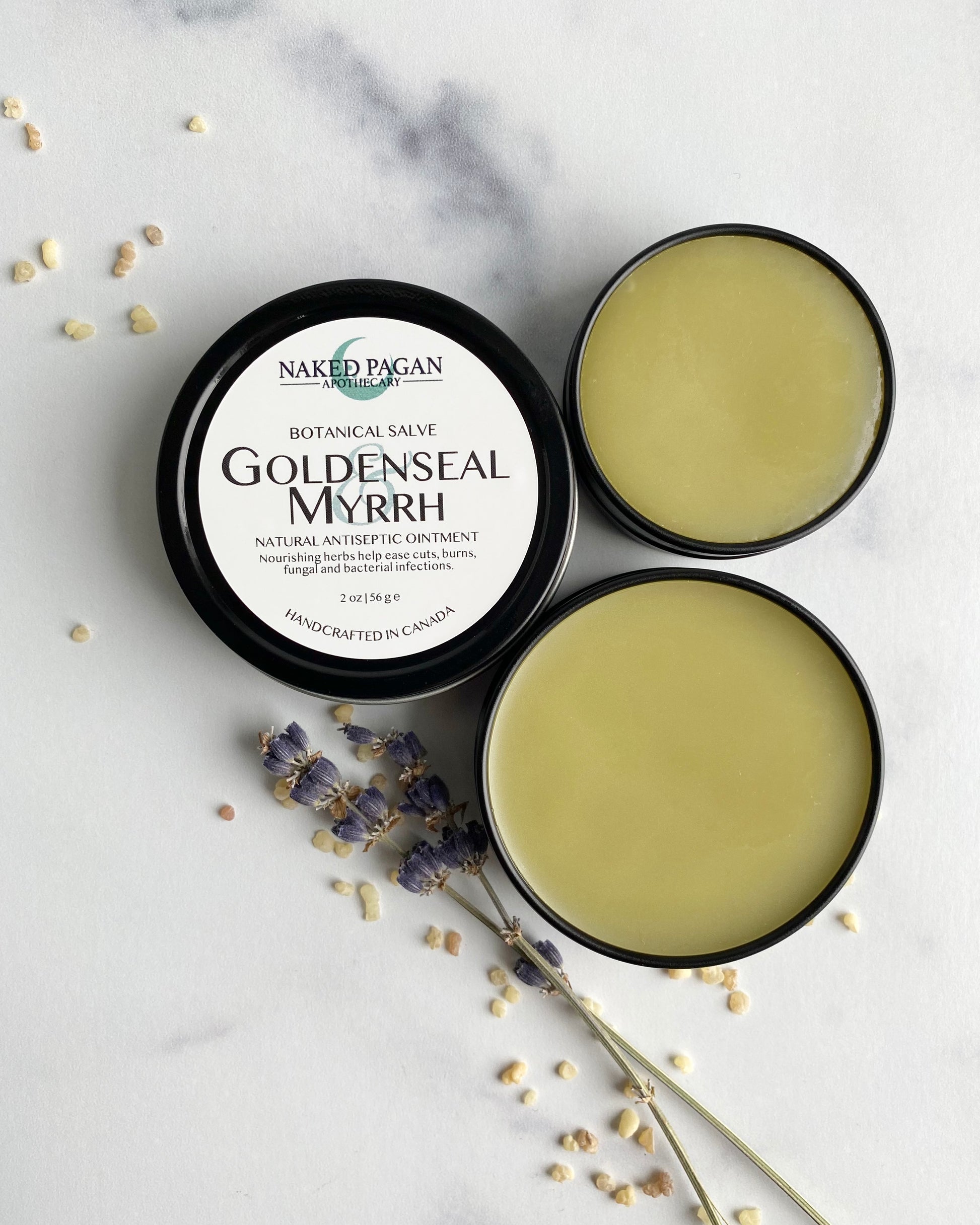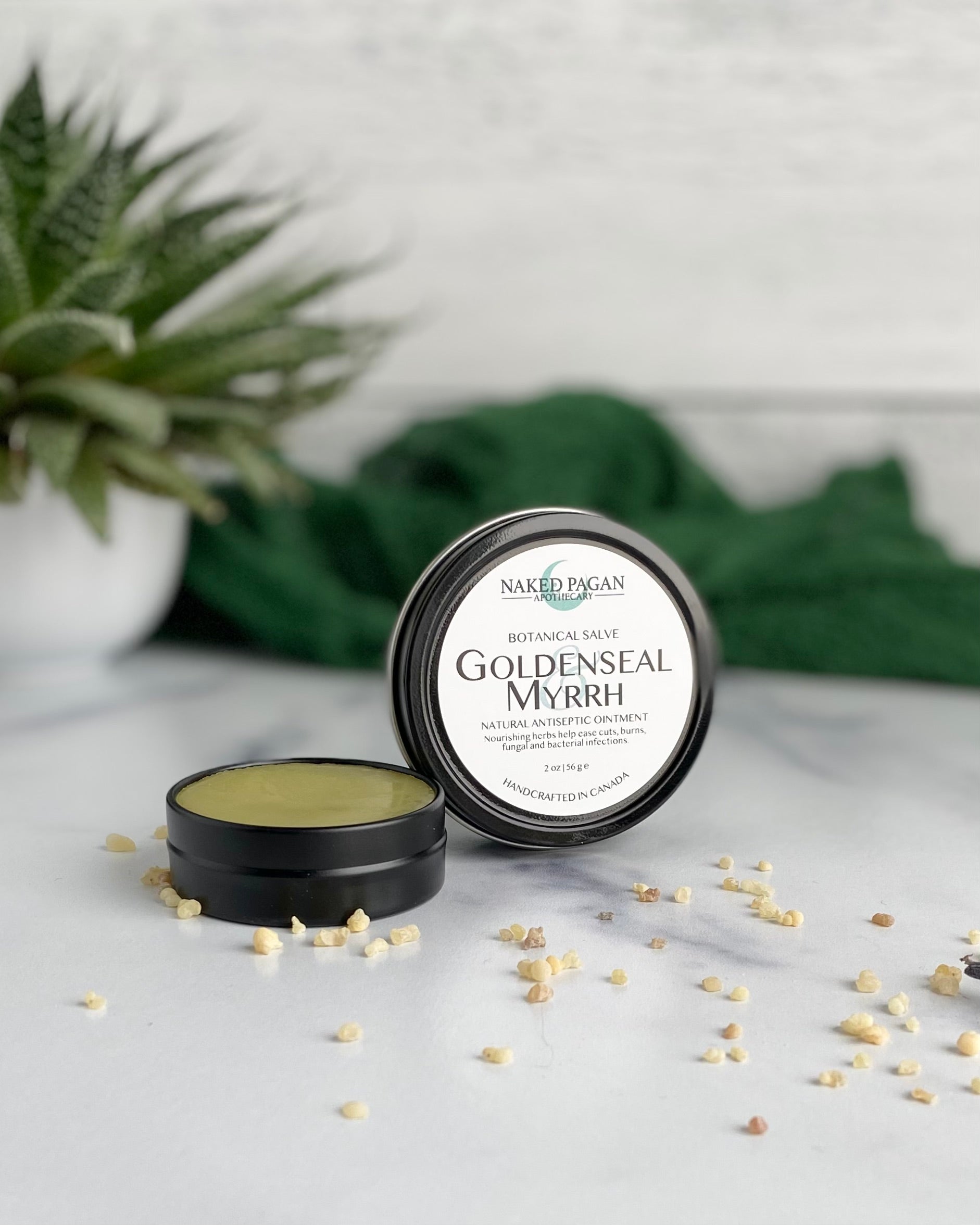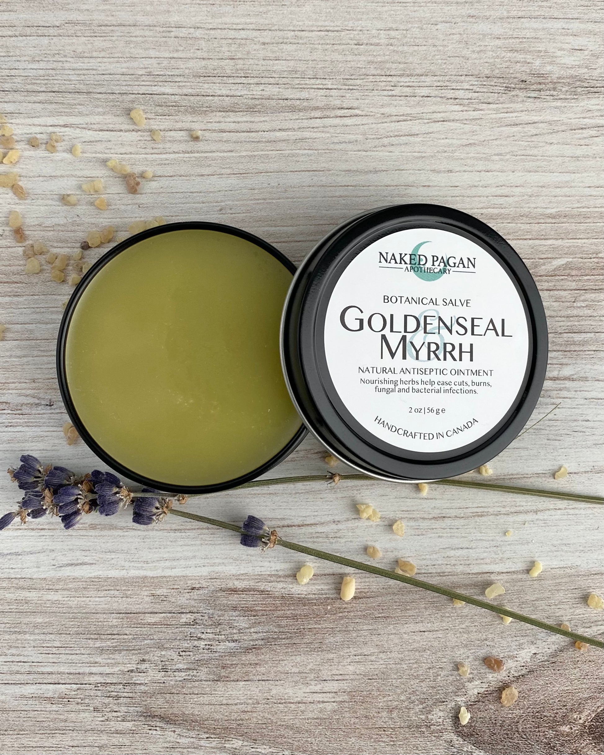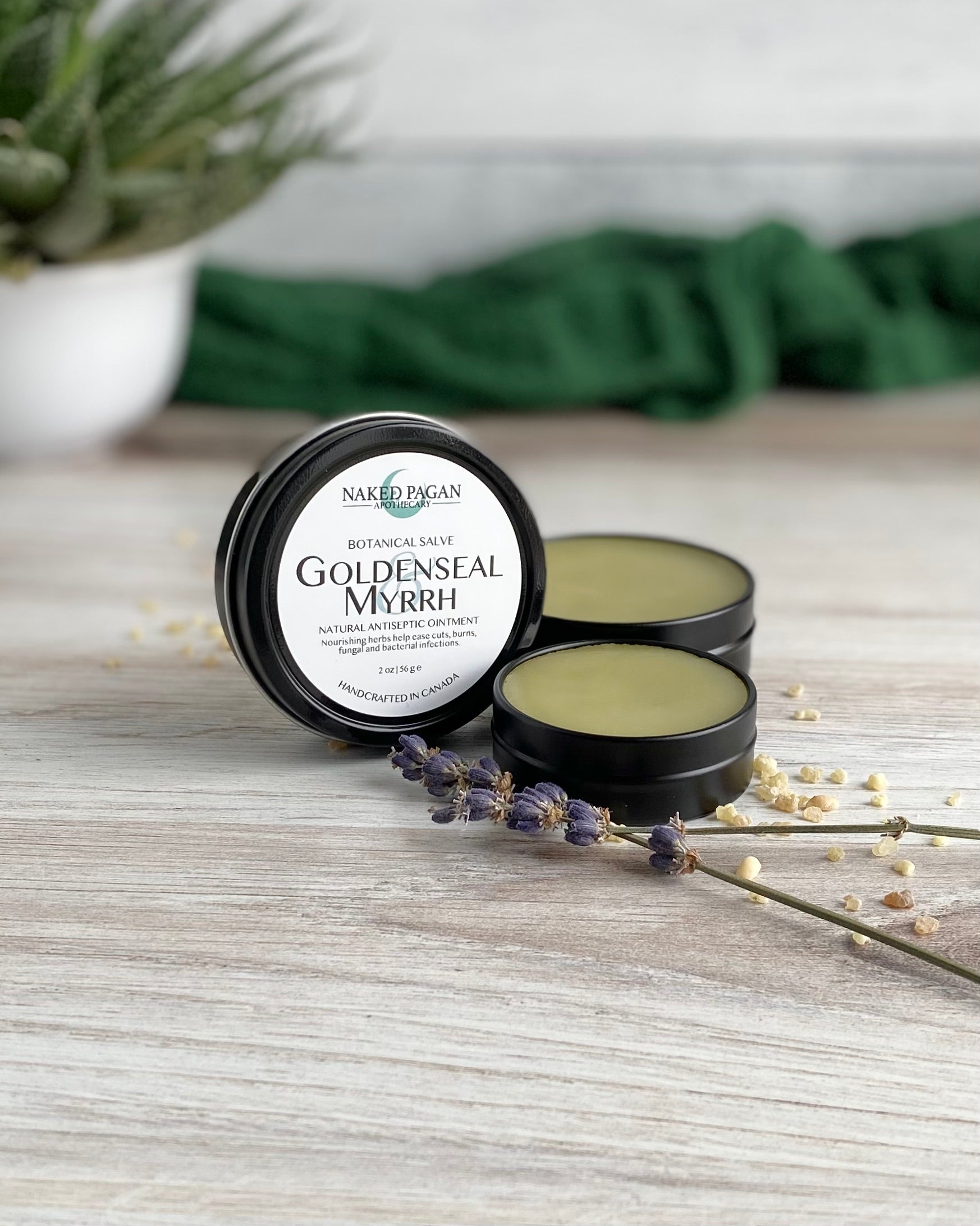 An organic salve made with the anti-bacterial, anti-fungal and anti-inflammatory properties of goldenseal root and myrrh gum combine to make a most effective disinfecting ointment; encouraging tissue regeneration and aiding in the healing process for psoriasis, eczema, burns, infections, cuts, wounds, scrapes, dry skin, etc.